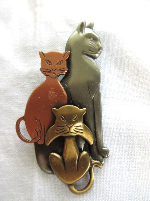 | シルバートーン、カッパートーン、アンティークゴールドトーンの3つの色合いの猫さんのブローチです。 | ||