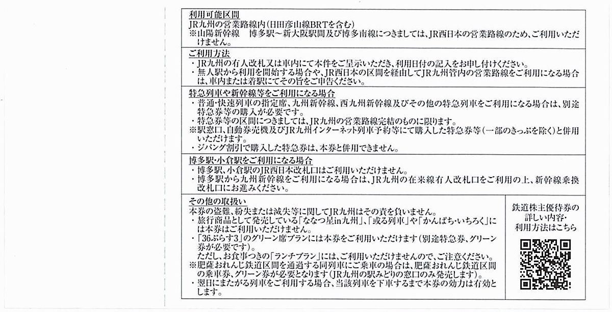 | 有効期限は「2026年6月30日」です。 お一人様1日限り、JR九州管内の快速・普通列車に乗り放題になります。 ※別途特急券等を購入いただければ、JR九州管内の新幹線、特急列車もご乗車いただけます。 ※詳細につきましては、画像やホームページの株主優待制度をご覧ください。 | |||