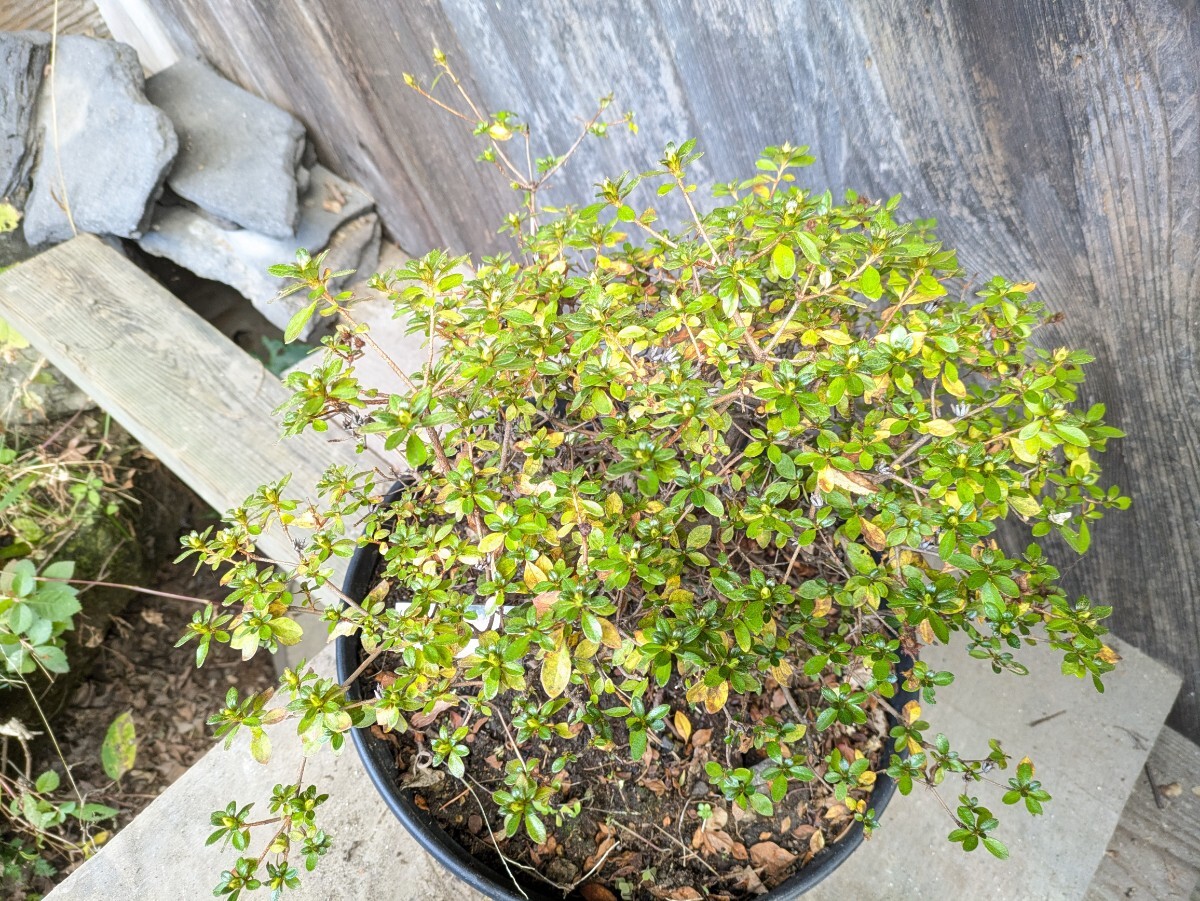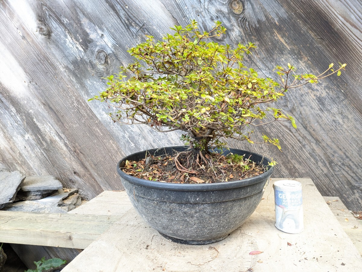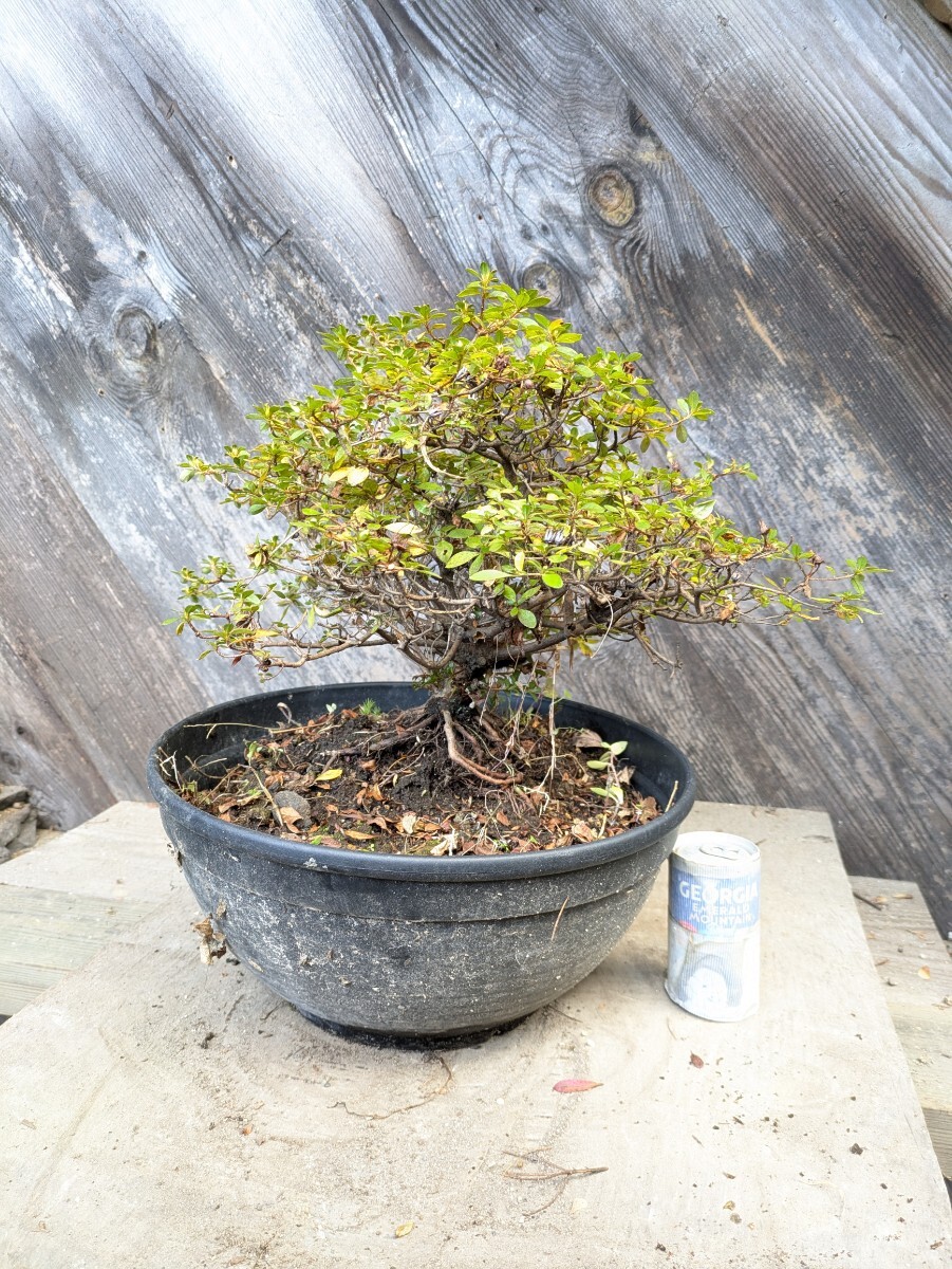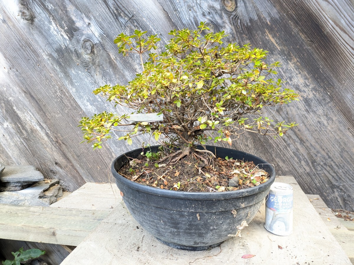 およそは40x40x43cmの枠に入るサイズ。根本付近からの高さは28cmくらい。20年以上経過の株ですが深山霧島ツツジなので幹は太く成りませんでした。プラ鉢は老朽化してます。発送梱包の際に痛むヶ所が有るかもしれません。佐川急便にて発送する事も有ります。