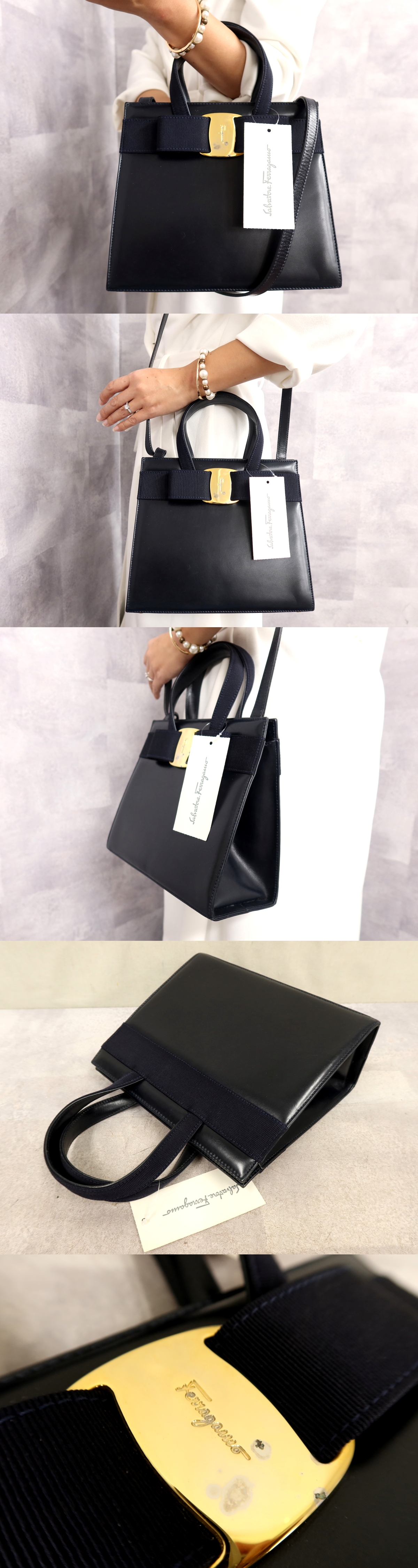 ●超美品●Salvatore Ferragamo フェラガモ●ヴァラリボン●カーフ レザー 本革●2way ハンド バッグ●ネイビー●ゴールド金具●Js62264 收藏
