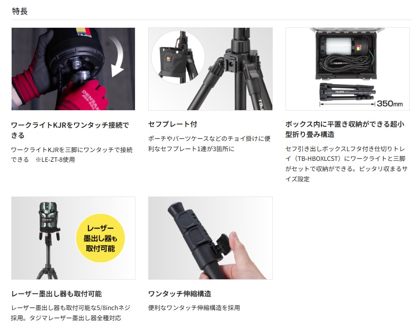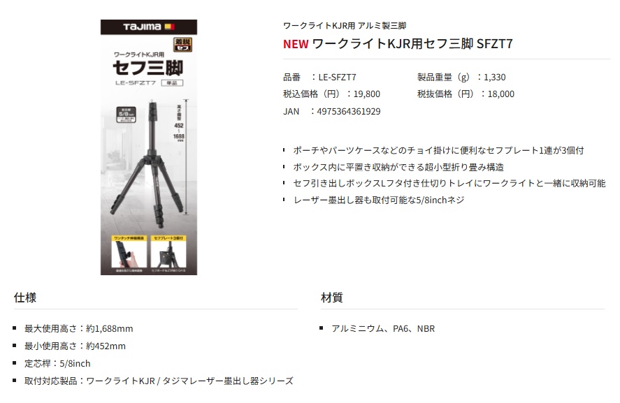 タジマ TAJIMAワークライトKJR用セフ三脚 SFZT7LE-SFZT7■特長・ポーチやパーツケースなどのチョイ掛けに便利なセフプレート1連が3個付・ボックス内に平置き収納ができる超小型折り畳み構造・セフ引き出しボックスLフタ付き仕切りトレイにワークライトと一緒に収納可能・レーザー墨出し器も取付可能な5/8inchネジ■仕様最大使用高さ:約1,688mm最小使用高さ:約452mm定芯桿:5/8inch取付対応製品:ワークライトKJR / タジマレーザー墨出し器シリーズ■材質・アルミニウム、PA6、NBR