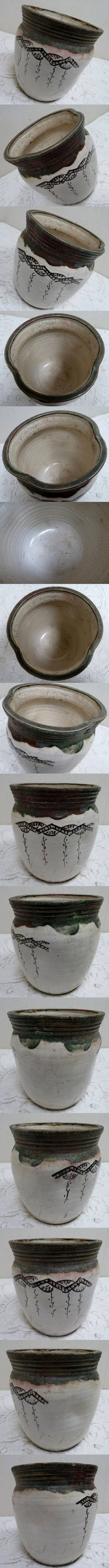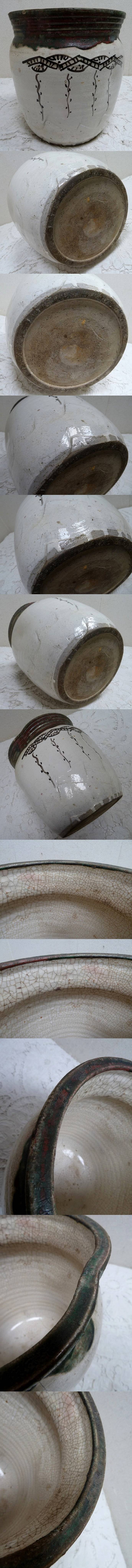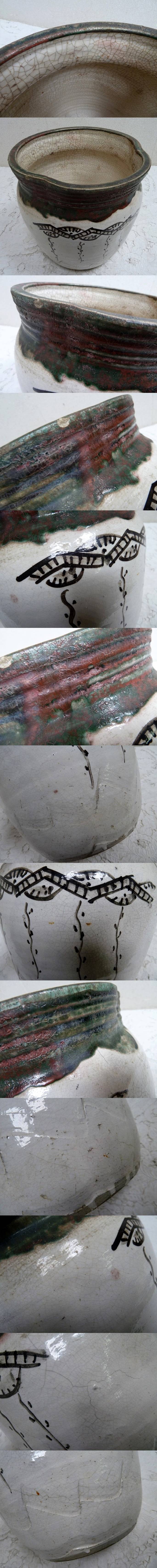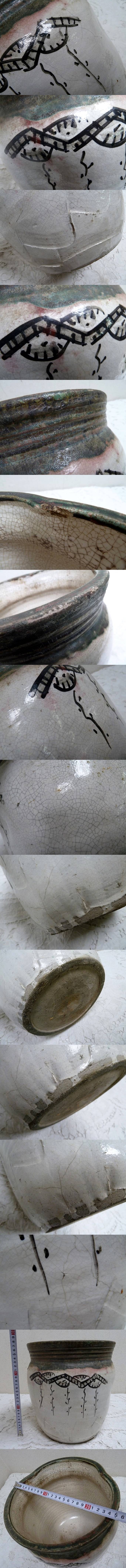 (☆BM)旧家蔵出し品/陶器製 古い壺 高さ27.8㎝/4.6kg 織部焼 水屋瓶 貫入り 藤柄 茶道具 植木鉢 レトロ 日本 水屋瓶 水壺 水指 收藏