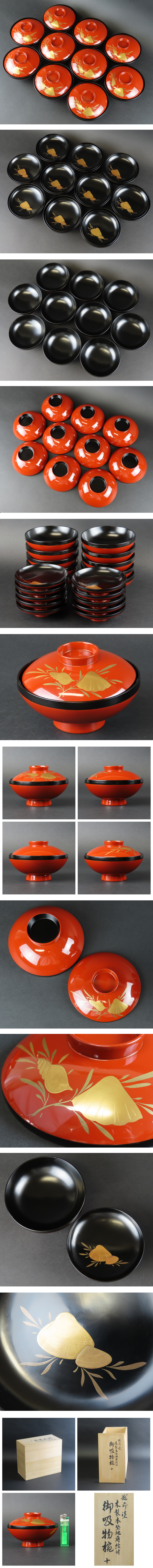 【月】【骨董品 茶道具49】厳選越前塗 吸物椀10客 木製本堅地 蛤巻貝文 / 輪島塗 漆器 蒔絵 收藏