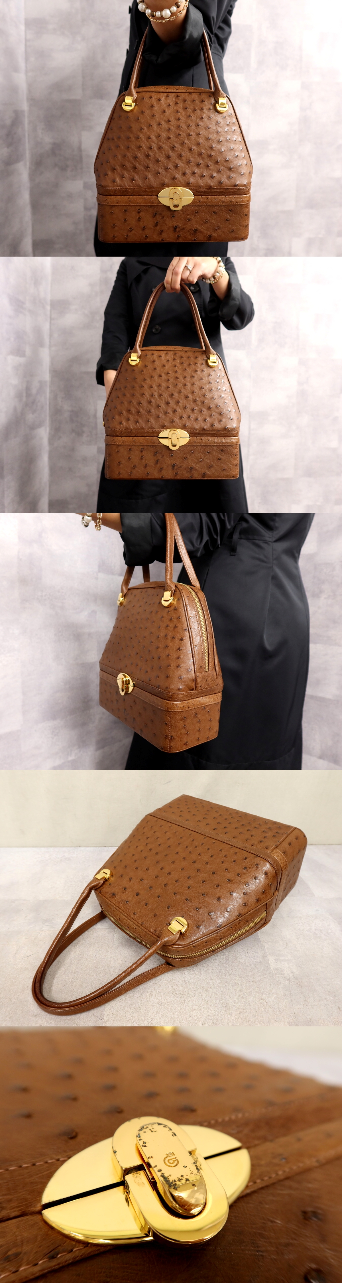 ●超美品●COMTESSE コンテス●ロゴ金具●オーストリッチ 本 ダチョウ 革●ハンド バッグ●ブラウン●ゴールド金具●腕掛け●Js63327 收藏