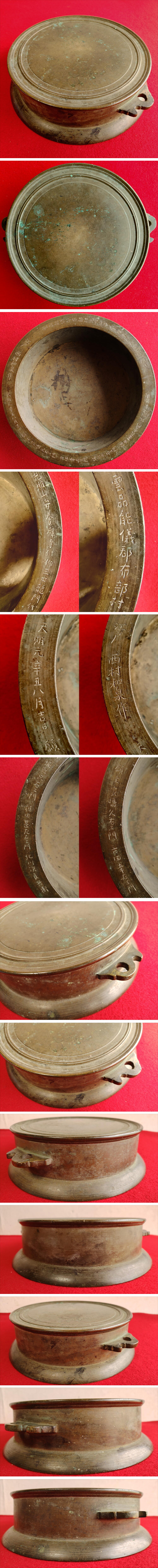 | 商品 | 天明元年(1781年) 江戸 西村和泉作 光明山安養禅寺什物 三世龍門代 古銅 双盤 鉦鼓 鉦吾 伏鉦 サイズ:約上面径2424cm×底面径28cm×厚さ7.5cm 重さ:4.84kg |