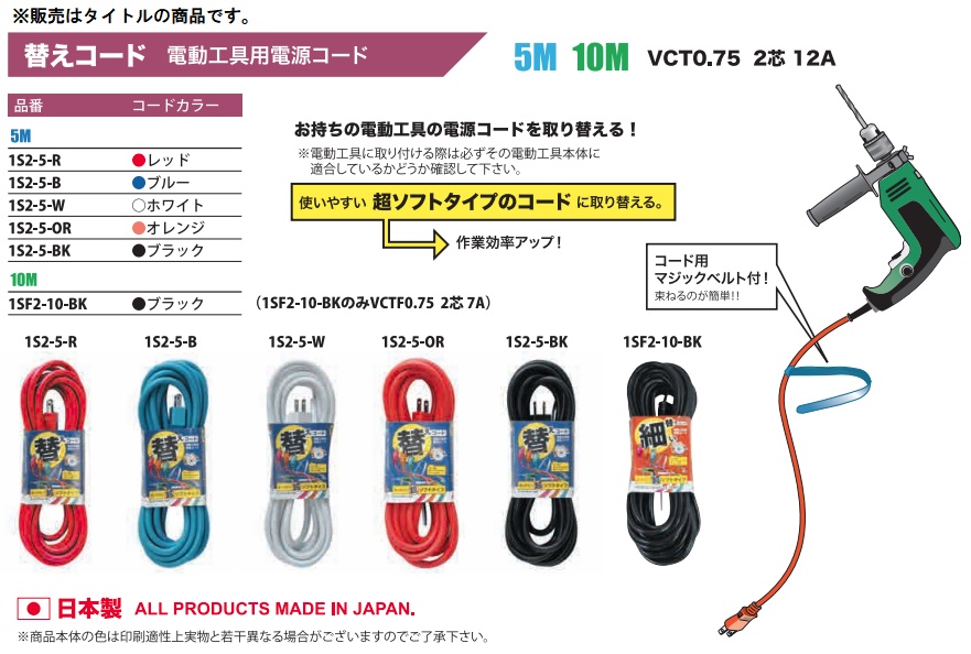 フジマック FUJIMAC替コード 10M 電動工具用電源コード1SF2-10-BK ブラック(VCTF0.75 2芯 7A)カラーコードで差をつけろ!カラーコードでイメージチェンジ!お手持ちの電動工具をカスタマイズ!■特長・コードは超ソフトタイプで作業効率も格段にアップ!・ご使用後はコードを束ねるのに便利なマジックベルト付き・現場での使用時に他のコードと絡みあっても、すぐに発見※ご注意:電動工具に取り付ける際は必ず電源コンセントより電源プラグを抜いたことを確認してから行って下さい※ご注意:電動工具に取り付ける際は必ず電動工具本体への適合を確認して下さい