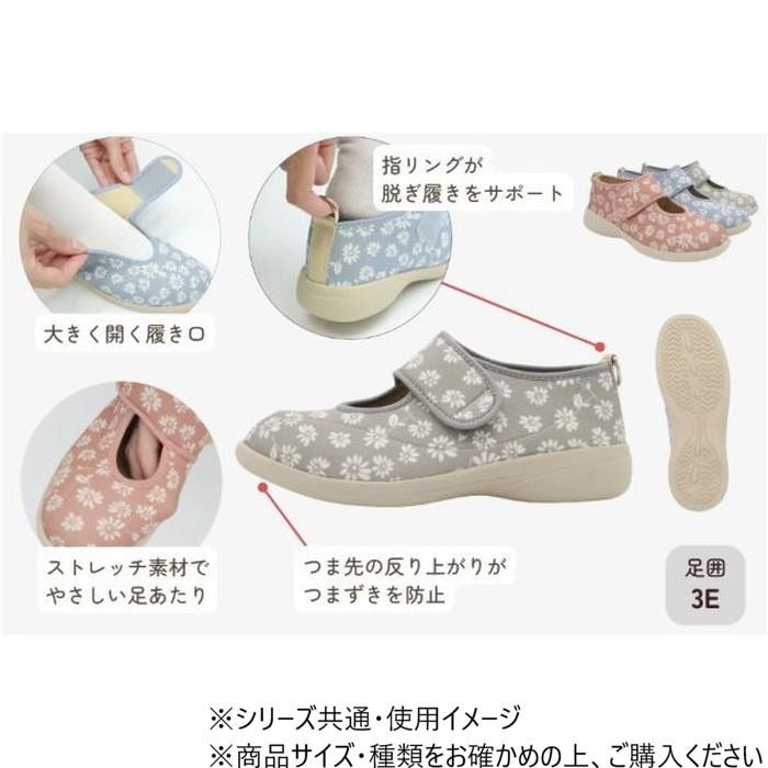 | やさしく包み込むフラワーシューズです。室内からお散歩、お出かけ用としてもお使いいただけます。外反母趾の方にもおすすめのやさしい足あたり。衝撃吸収・屈曲性に優れた靴底で、屋内・屋外でご使用できます。かかとの指リングが脱ぎ履きをサポートいたします。 |