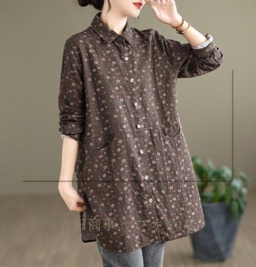 A7850☆チュニックカジュアル シャツ チュニック 小花柄 ロング ブラウス長袖 襟付き上品大人ロングシャツ レディース サイズ選択可 收藏