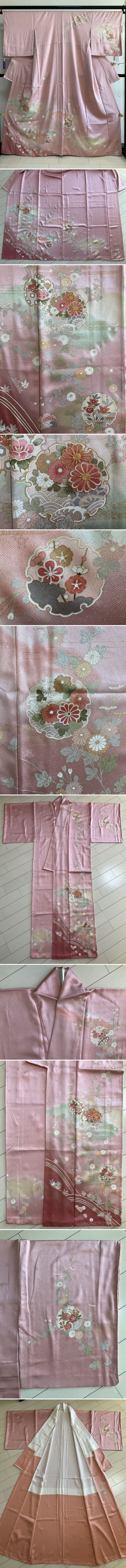 ■E3932■中古美品■正絹■珊瑚色 地紋 雪輪文に花模様 金彩 袷 訪問着■丈165 裄68■丈長 裄長 收藏