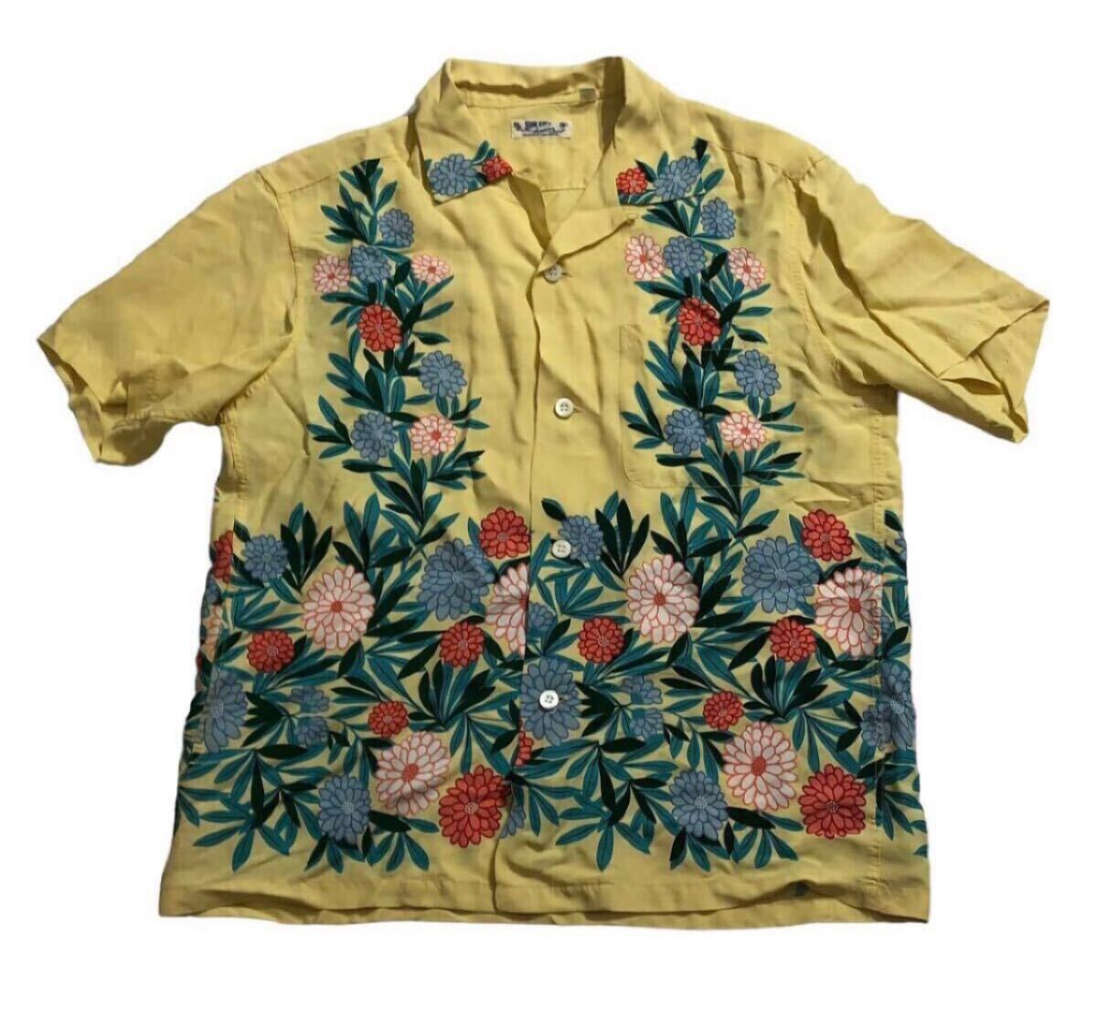 送料無料 ● 東洋 SUN SURF サンサーフ ● 和柄 菊 総柄 プリント 半袖 レーヨン アロハシャツ ライトイエロー S 收藏