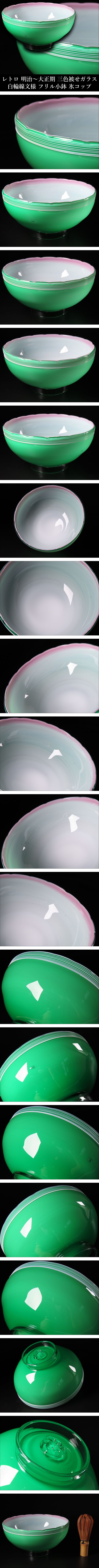 【ONE'S】蒐集家所蔵品 レトロ 明治~大正期 三色被せガラス 白輪線文様 フリル小鉢 氷コップ コンポート皿 テーブルウェア 古美術品