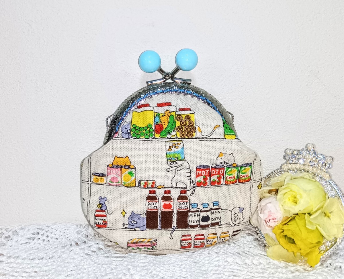 ネコちゃん パントリー がま口ポーチ*こばやし*あめ玉ひねり 綿麻 小銭入れ 小物入れ*薬入れ*ネコ ねこ 猫 棚*がま口 ポーチ*ハンドメイド 收藏