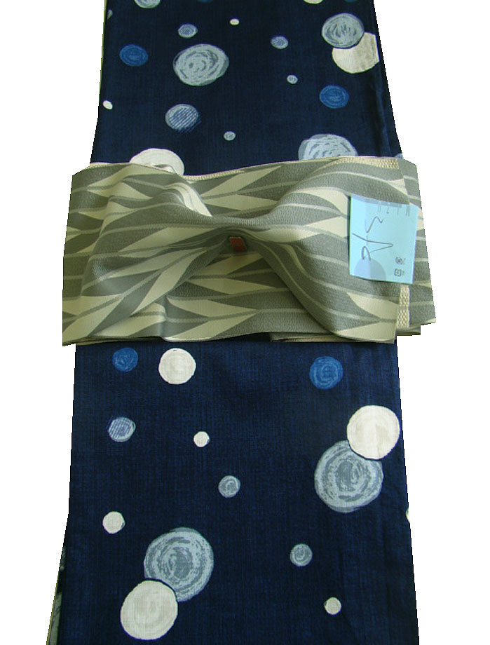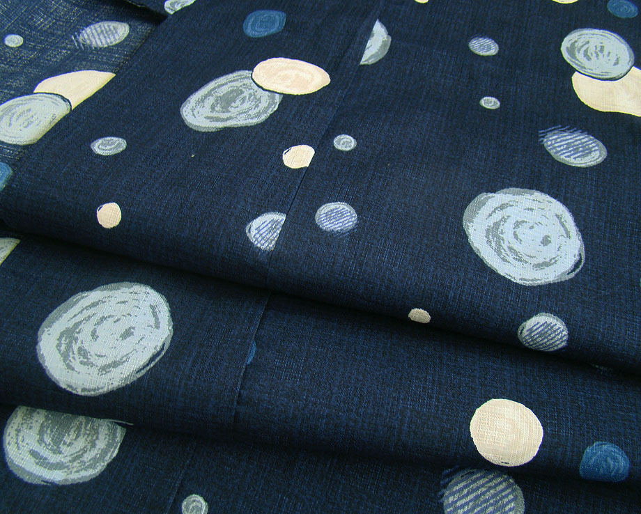 紺色地に練色、水浅葱色、藍色等の水玉柄。