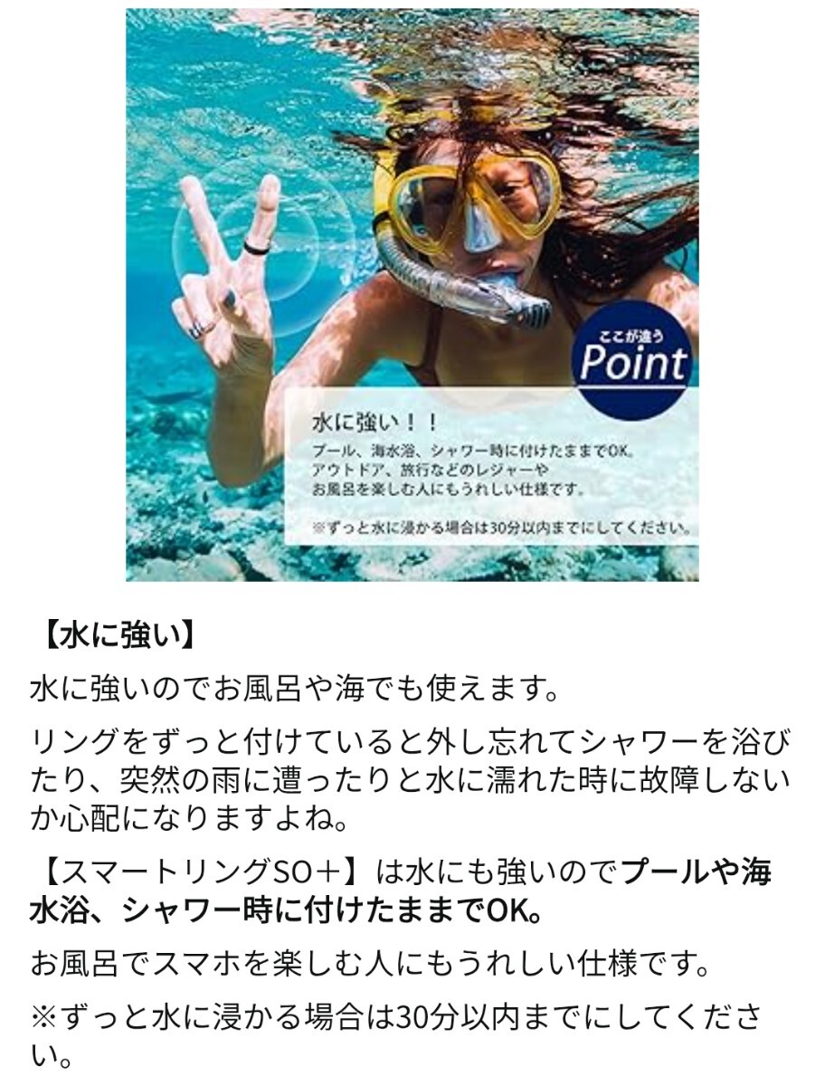 ■【水に強い】スマートリングSO+はプールや海水浴、シャワー時に付けたままでOK。 お風呂でiphone アンドロイドを楽しむ人にもうれしい仕様です。※ずっと水に浸かる場合は30分以内までにしてください。