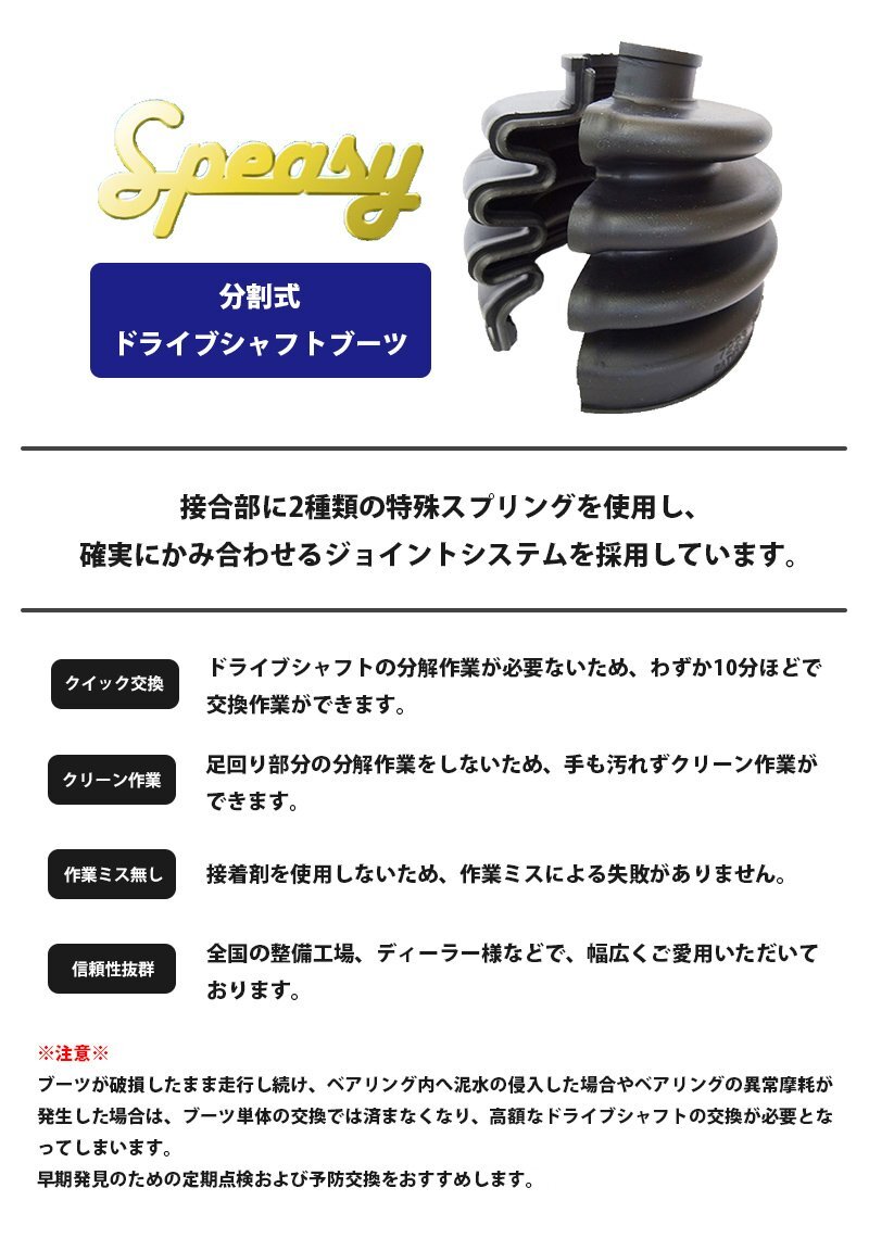 ・ スピージー製の外側 ( ホイール側 ) 分割式ドライブシャフトブーツです。 全国の整備工場、ディーラーなどで幅広くご採用頂いております。接合部に2種類の特殊スプリングを使用し確実なジョイントシステムを採用。足回りの分解作業をしないため、手も汚れずクリーン作業ができます。接着剤を使用しないため、作業ミスによる失敗が全くありません。スピージーの接合部はオス部に平バネ、メス部にUバネと特殊なスプリングを内蔵。さまざまな国で特許を取得しております。 ・ この商品は【外側 ( ホイール側 ) 】用です。 ◆車種適合について 車種適合にご不安な場合は、 メーカーホームページをご覧いただくか、 弊社お問合せ窓口までお気軽にお問合せください。 ●検索ワード 車検 修理 ブーツ 分割 おすすめ ランキング ドライブシャフト 簡単 取付簡単 交換 スピージー SPEASY 整備 足回り 異音 シャフトブーツ | ||||