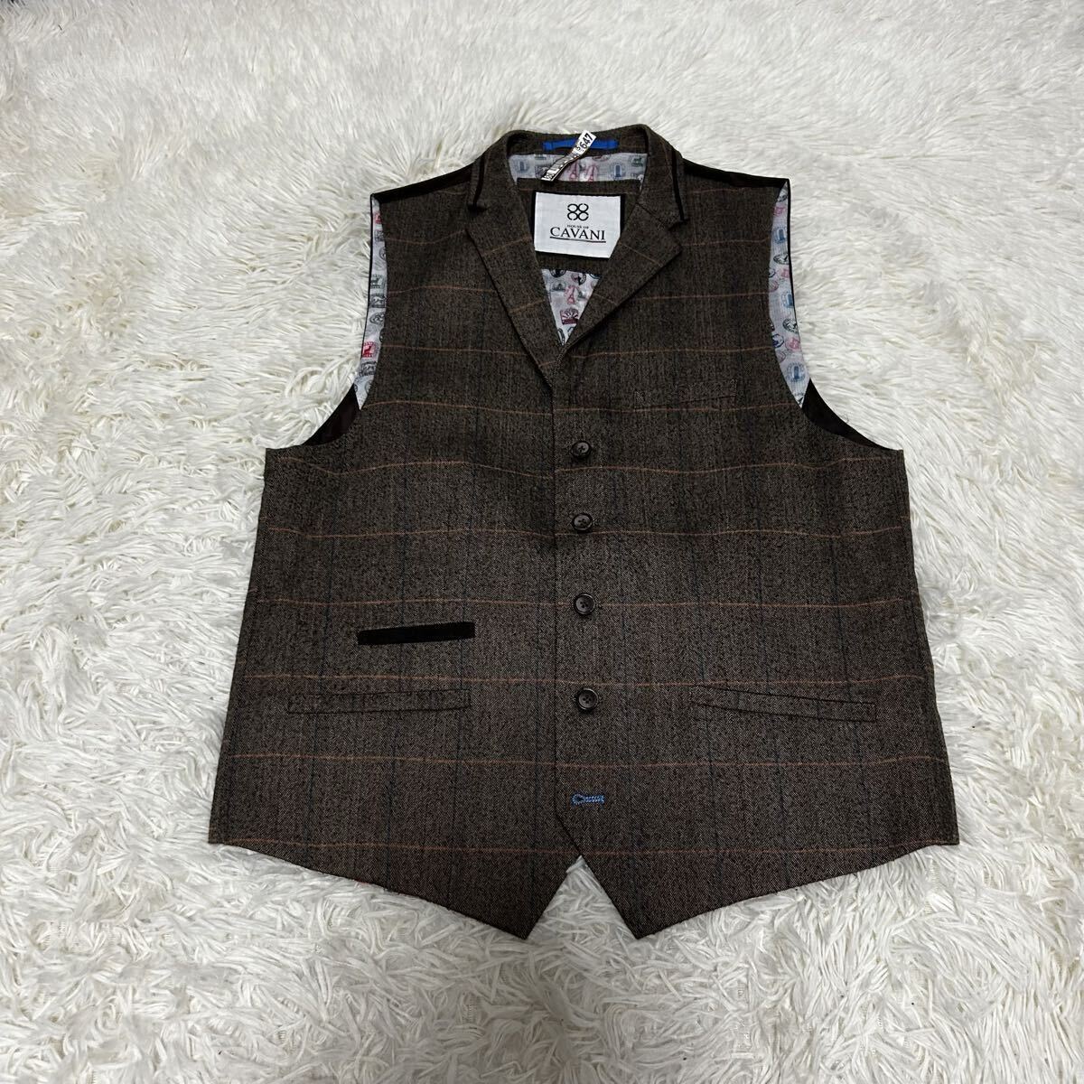 1円 HOUSE of CAVANI 至高の3ピーススーツ セットアップ スリーピース テーラードジャケット ブラウン チェック 総柄 ツーボタン 総裏地 茶 收藏