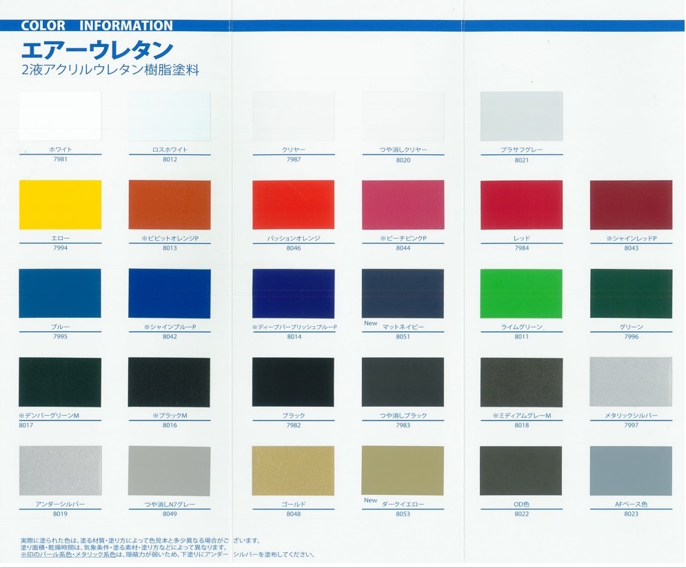 イサム塗料エアゾール 【内容量】315ml 【標準塗り面積】0.6~1.0㎡(2回塗り) ★特徴 優れた光沢・肉持ち・耐候性・耐水性・耐薬品性 !! 2液性アクリルウレタン樹脂塗料が簡単にスプレー可能!! ★用途 ○自動車・オートバイなど ○各種パーツ ○金属製品(非鉄金属[アルミ・ステンレス等]への直接塗装は除く) ○プラスチック類(FRP、ポリエステル、ポリアミド、硬質塩ビなど) ※色見本は撮影状況・モニターにより実際の色と異なるため、 イメージとして参照下さい。 ◆複数色ある場合 ①ご希望色×必要数量を落札 ⇒ まとめて取引依頼 ②質問にてご希望色×数量を連絡 ⇒ 合計金額にて個別出品 ⇒⇒ エアーウレタン29色 他出品商品はこちら | |