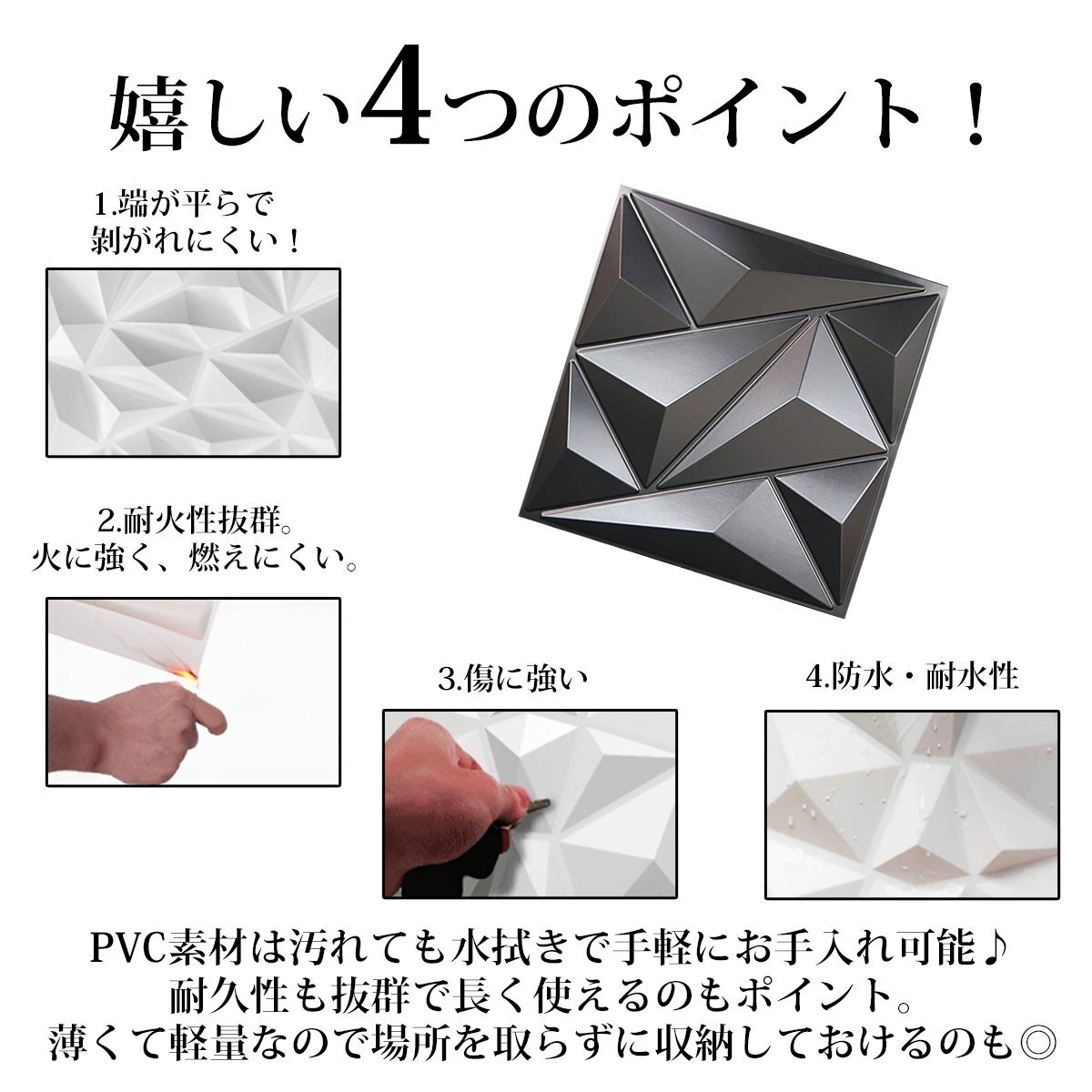 立体壁面装飾パネル、3Dボード(スリーディーボード)は、表面に凹凸のある壁面パネルです。 貼り付ける向きによって様々なデザインのパターンを実現可能。 また、壁全体を埋めるだけでなく数枚で一部を装飾するなど アイデア次第で様々な場所でご使用頂けます。 接着剤、両面テープ等で壁に接着して施工します。 部屋を明るく、ダイナミックで豪華な雰囲気に変えることが出来ます。 軽量デザインで耐火・防水性があるPVC製の丈夫な立体パネルです。壁全体を装飾したり、 数枚で一部を装飾するなどアイデア次第で幅広い場所にご使用頂けます。 パネルに色を塗装できるのも嬉しいポイントです。 壁のキズ隠しや汚れ隠しはもちろん、インテリアのアクセントにも最適。 猫の爪痕もバッチリ隠せます。 ■商品詳細 ・33枚set ・カラー:ダイヤモンド×マットブラック ・サイズ:30cm×30cm×1mm |