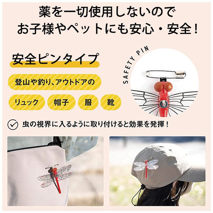 【商品特徴】 殺虫剤×忌避剤をしようしない世界初虫除けグッズ アキアカネの主食は小昆虫。小昆虫の天敵はアキアカネ。 虫が嫌がるから寄ってこない!小昆虫に効果抜群! 殺虫剤・忌避剤等をしようしていないので何年でも使用できます。 安全ピンタイプ ゴルフ・キャンプ、ベランダ・軒先、ベビーカー、オープンカフェ・飲食店 ・フックやカラビナ等で風通しの良い所に取り付けると効果的! ご注意 ・直射日光に長時間あたると、変色・色落ち・変形します。 ・小さいお子様のおもちゃとして使用しないで下さい。 ・強い衝撃を与えると欠損・欠落します。 ・火の近くで使用しないで下さい。燃えたり溶けたりします。 ・暗い場所ではあまり効果がありません。 ●商品名:虫よけグッズ あかねちゃん【安全ピンタイプ】 ●ブランド:EDISON GOLF ●パッケージサイズ:150×20×130mm ●重量:3g ※撮影時の光量の具合や、ご覧いただいております画面環境によりまして、実際の商品と若干色味が違う場合がございます。