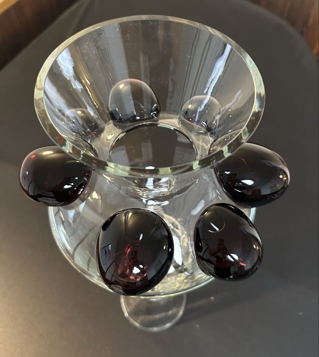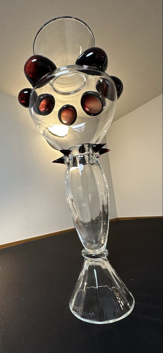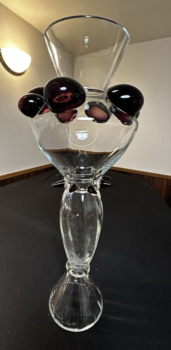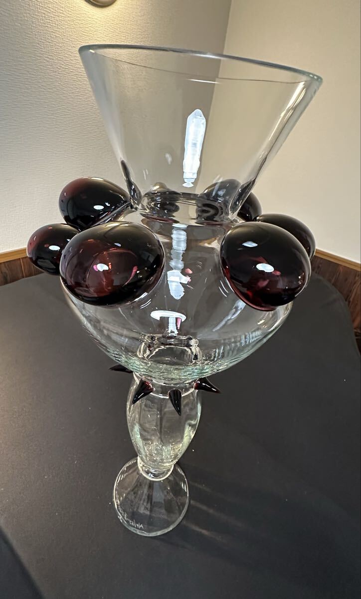 非対称的で複雑な構造: 上下のガラスの形状が異なり、中央付近のくびれた部分には黒い突起状の装飾、その上のクリアなガラスには**クリムゾンレッド(濃い赤)の大きな球体(玉)が数個取り付けられています。