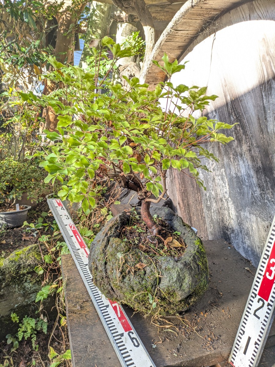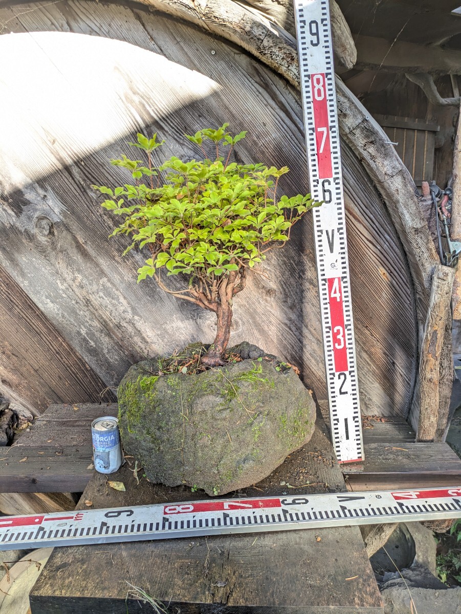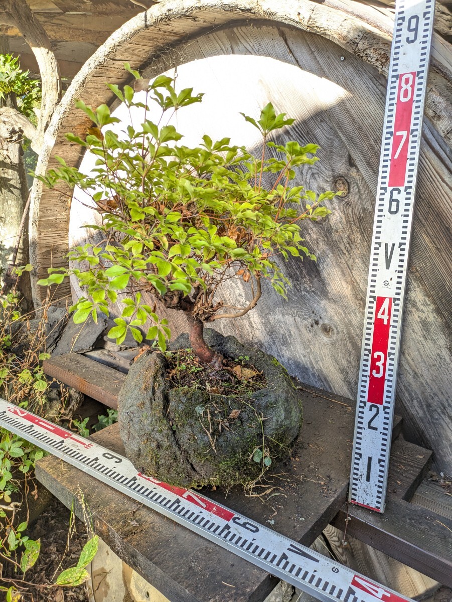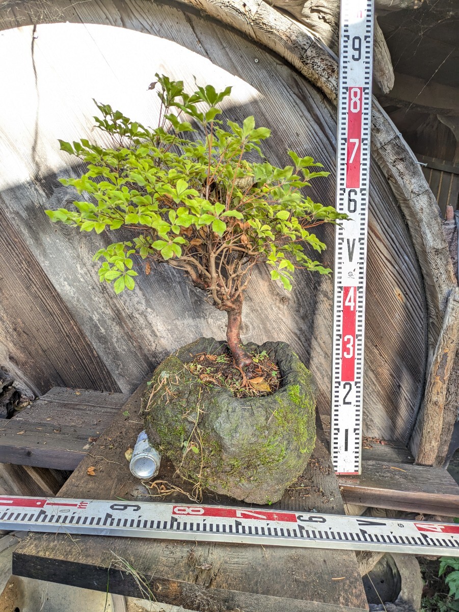 およそは40x40x70cmの枠に入るサイズ。根本付近からの高さは50cmくらい。溶岩鉢の底は座りが作って有りません。15年以上前に赤ヤシオツツジを植えて その後育った木です。溶岩鉢は老朽化してます。花芽は無し。発送梱包の際に痛むヶ所が有るかもしれません。佐川急便にて発送する事も有ります。