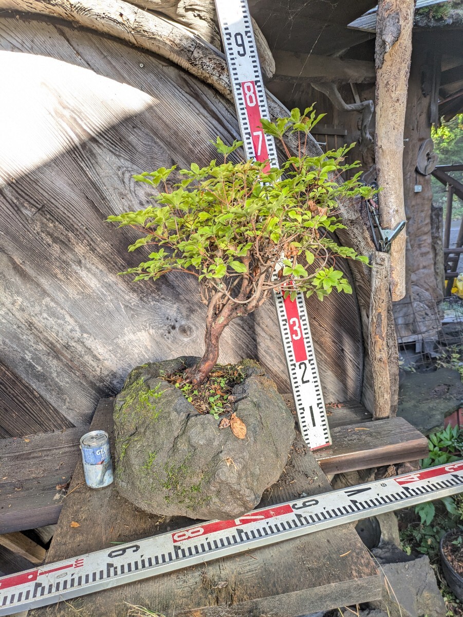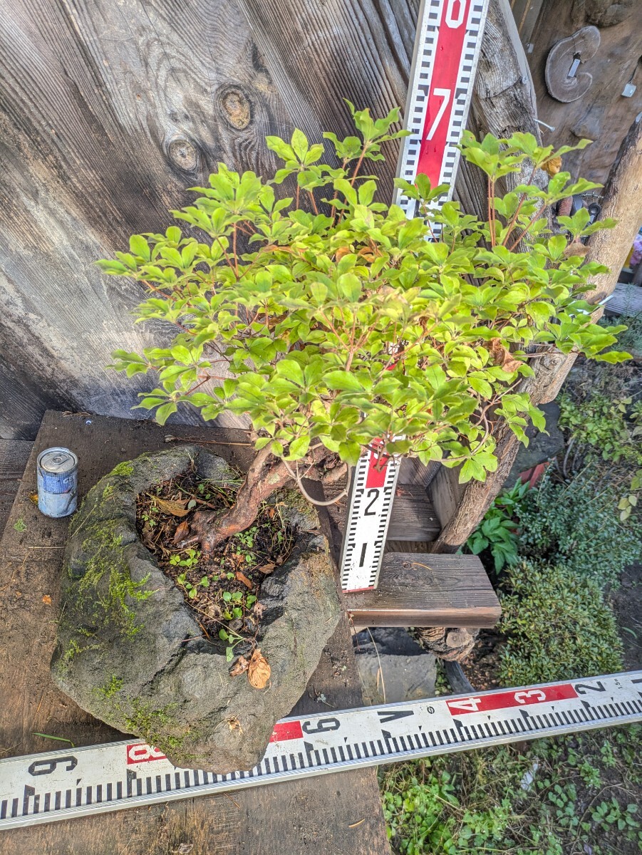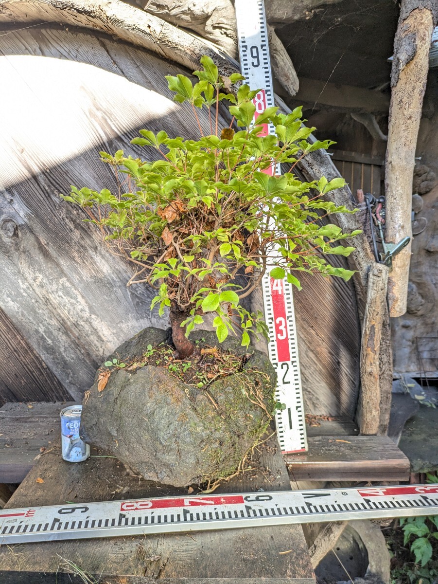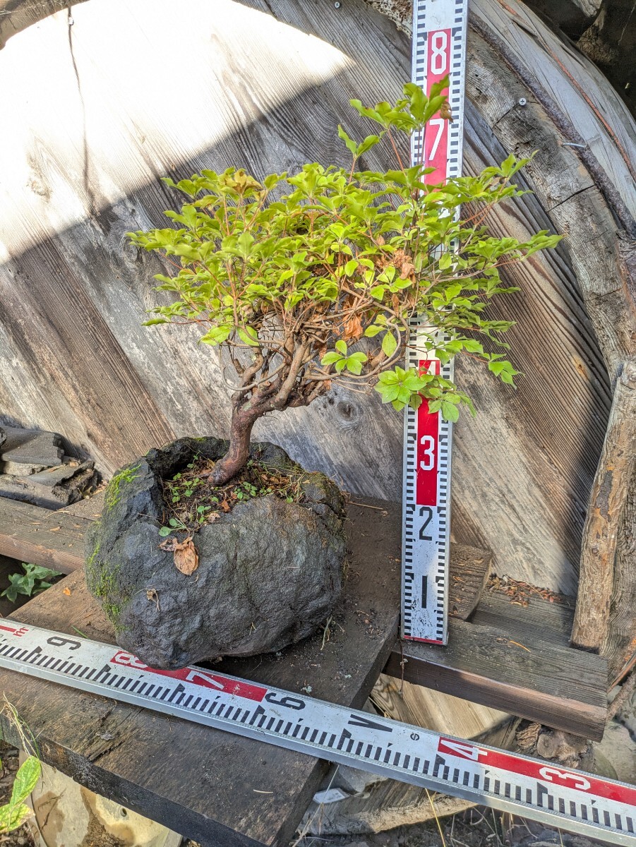 およそは40x40x70cmの枠に入るサイズ。根本付近からの高さは50cmくらい。溶岩鉢の底は座りが作って有りません。15年以上前に赤ヤシオツツジを植えて その後育った木です。溶岩鉢は老朽化してます。花芽は無し。発送梱包の際に痛むヶ所が有るかもしれません。佐川急便にて発送する事も有ります。