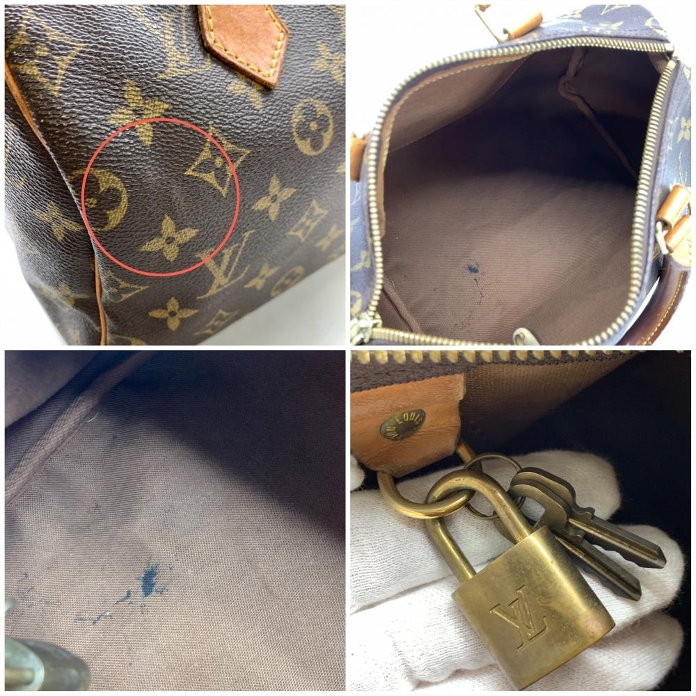 角スレ、ヌメ革のヤケ・スレ・小キズ・シミ・シワ、ファスナープルの薄いヒビやスレ、生地スレや色ヤケ(色褪せ)、金具の小キズや青錆、持ち手の黒ずみ、内側の汚れなどみられます。