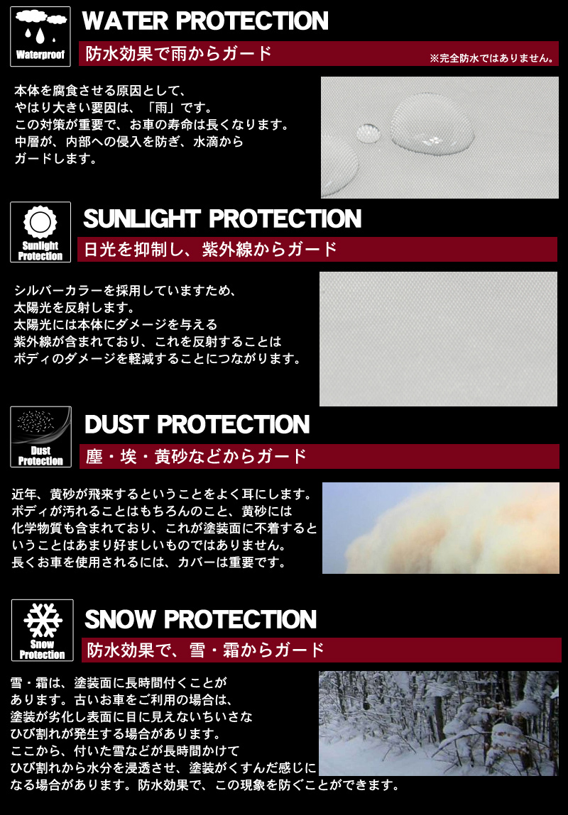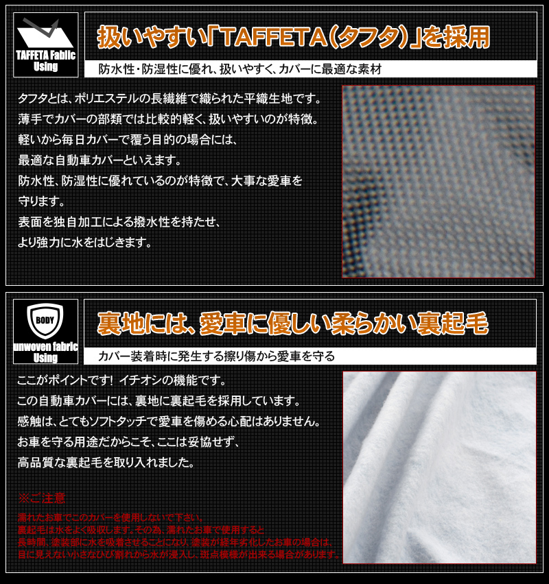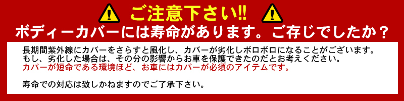 | 注意 | 古い年式の車種ほど経時劣化により、 ボディー塗装面に微小なひび割れ等ができ、 シミの様な模様が発生しやすい状態になってます。 車体及びカバーが濡れた状態でご使用になられた場合、 シミ模様が発生する可能性が非常に高くなります。 カバー使用中に万一塗装面に変化が見られた場合は、 直ちにカバーのご使用をおやめください。 |