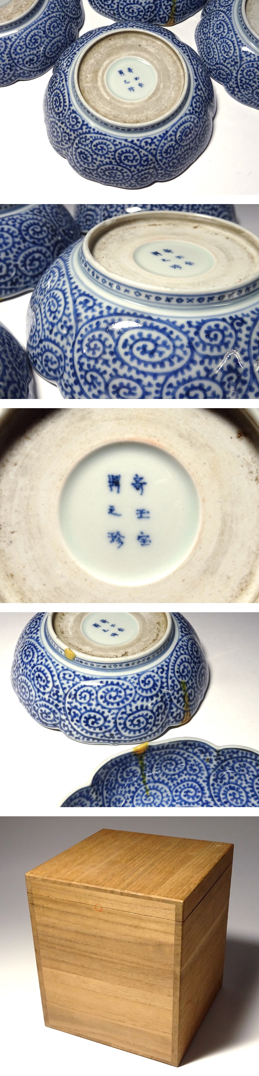 慶應◆江戸時代 古伊万里 染付蛸唐草見込松竹梅文 輪花なます皿五客 奇玉宝鼎之珍銘 桐箱入 收藏