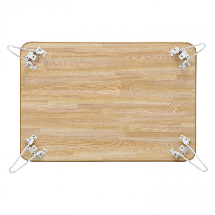 | 素材・材質 | 甲板の表面材:プリント紙化粧パーティクルボード 表面加工(甲板):ポリエステル樹脂塗装 構造部材(天板側面):合成樹脂(PVC) 構造部材(脚部):金属(鋼) 表面加工(脚部):エポキシ樹脂塗装 |