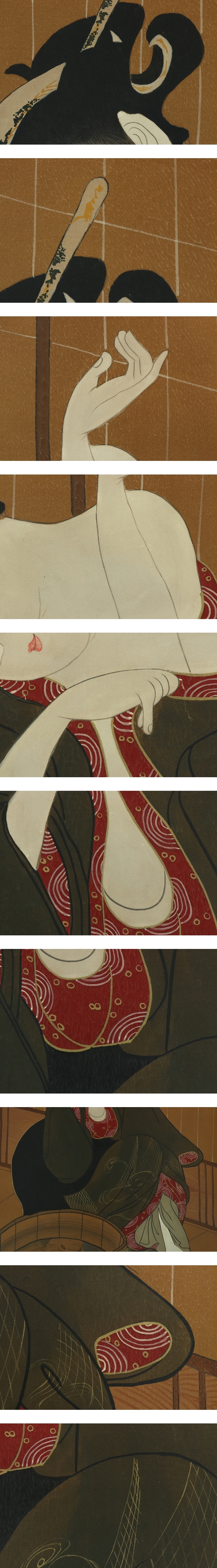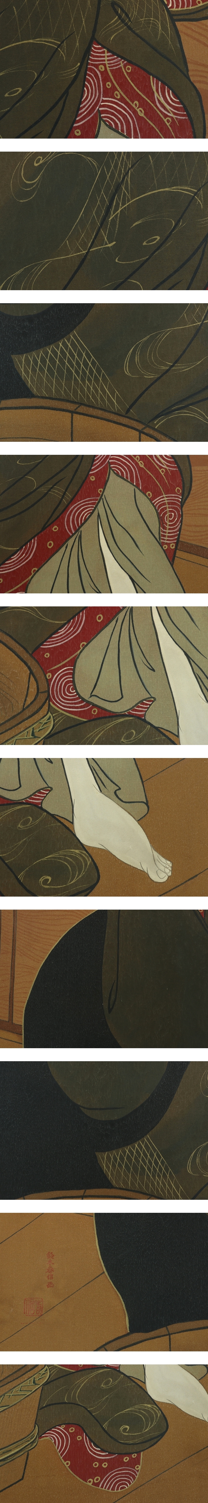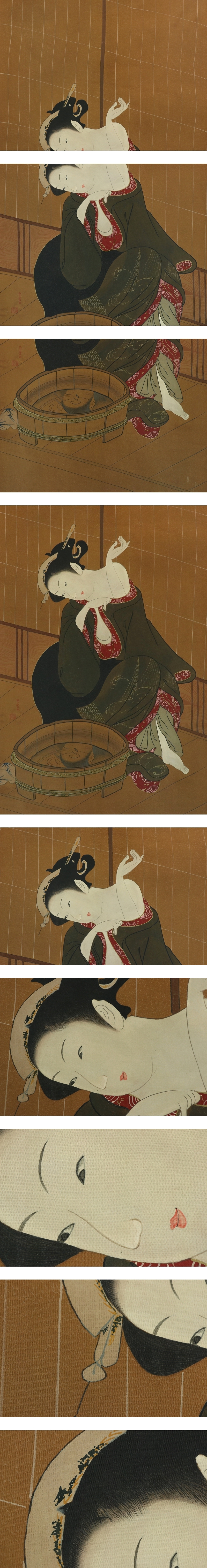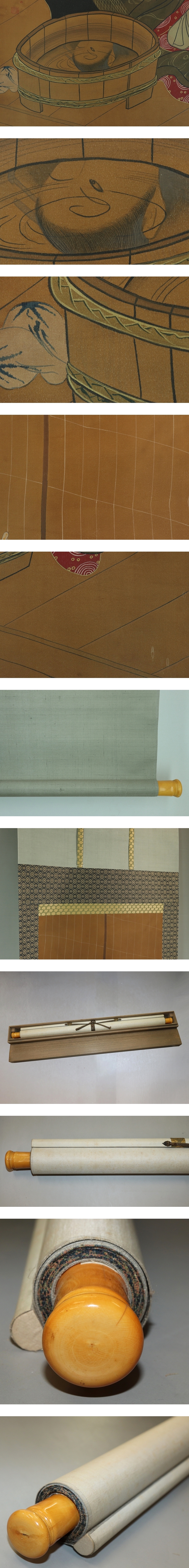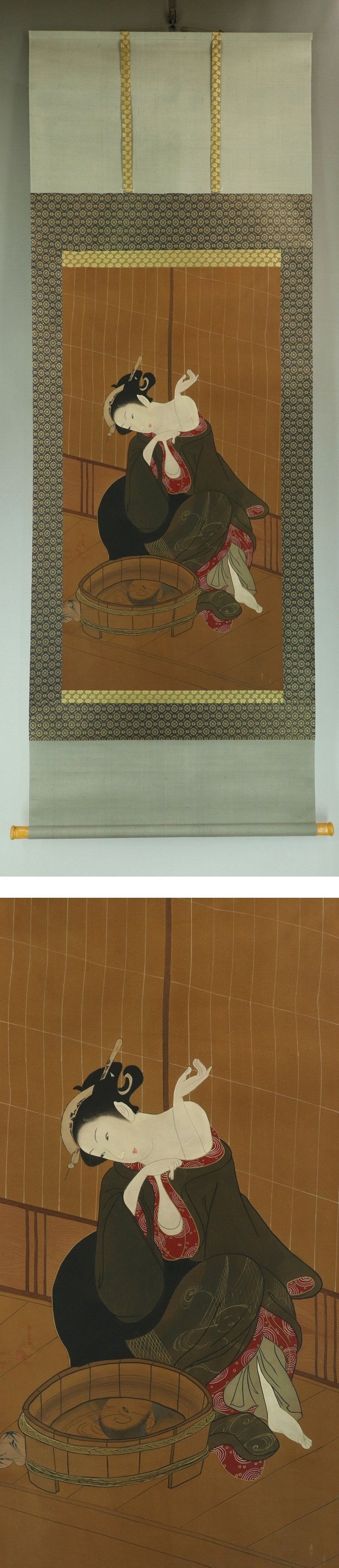 鈴木春信 すずき-はるのぶ(1725-1770) 江戸時代中期の浮世絵師。享保10年生まれ。江戸の人。 明和2年当時流行の絵暦の制作を機に,巨川らの協力を得て錦絵(多色刷り木版画)を創出。 美人風俗画で人気絵師となった。師は西村重長あるいは西川祐信。 明和7年6月15日死去。46歳。 本姓は穂積(ほづみ)。通称は次郎兵衛。号は長栄軒,思古人。 本紙は、染み、軽い波打ちがあります。 表装は、軽い染み、軽い汚れ、皺、軸先にヒビがあります。 【サイズ】 作品 横約53.5cm×縦約104cm 表装 横約68cm×縦約197cm |