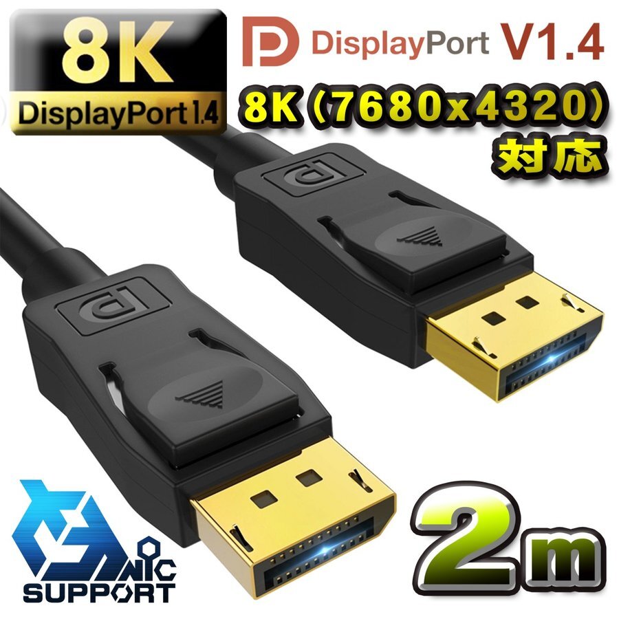 8K(7680x4320)対応 Displayport ケーブル 2m DP1.4 ケーブル 対応 Ver1.4 フルハイビジョン 8K/60Hz 4K/120Hz 3D HDR 2メートル■ケーブルの長さ■・2メートル(Ver.1.4)■対応規格Displayport Ver 1.4■機能・【高解像度】DisplayPort ケーブルはバージョン1.4です。4K@144Hz 、8K@60HZ または2060p・1080pなどのディスプレイ、モニタ、テレビ、プロジェクタとも下位互換性があり、解像度などの相性の心配ありません。・【画像・音声対応】このDP ケーブル1本で、高精細で立体感、臨場感のある映像/画像と音声の転送ができます。最大32の非圧縮デジタル音声チャネル、1536kHz/24bit までのオーディオストリームに対応しています。迫力のあるゲーム環境を構築することが可能。・【マルチディスプレイ対応】複数のディスプレイを接続することにより、マルチストリーム転送 (MST)を簡単に実現することができます。・【安定・超耐久】銀メッキ芯線、耐腐食性の金メッキコネクターを採用。■詳細・8K ウルトラ HD 4320P (7680 × 4320) で 30 hz-60 hz・5K ウルトラ HD 2880 p (5120 × 2880) 30 hz-60 hz・4K ウルトラ HD 2160 p (3840 × 2160) 30 hz-120 hz