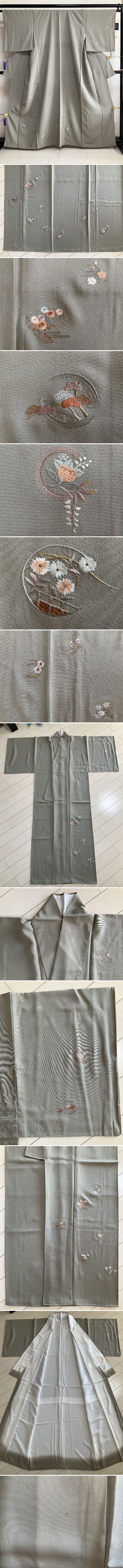 ■E3926■中古美品■正絹縮緬■柳鼠色 花模様 手刺繍 袷 付下げ 着物■丈162 裄66■裄長 洒落着 收藏