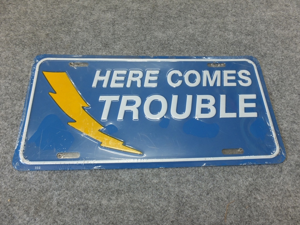 USA化粧プレート ナンバープレート ライセンスプレート HERE COMES TROUBLE 厄介者がきました 長期在庫 未使用展示品傷汚れ有です。画像でご確認ください。ノークレーム、ノーリターン、アメリカからの輸入品にご理解のある方。発送まで少々お時間をいただく場合がございます。