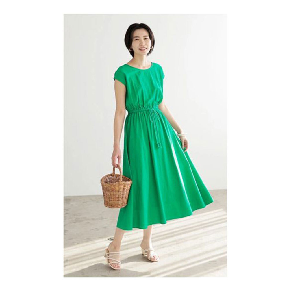 ☆ グリーン ☆ 3Lサイズ ☆ リネン風ウエスト絞りロングワンピース ワンピース ロング レディ-ス ロングワンピース ワンピ ロングワンピ 收藏