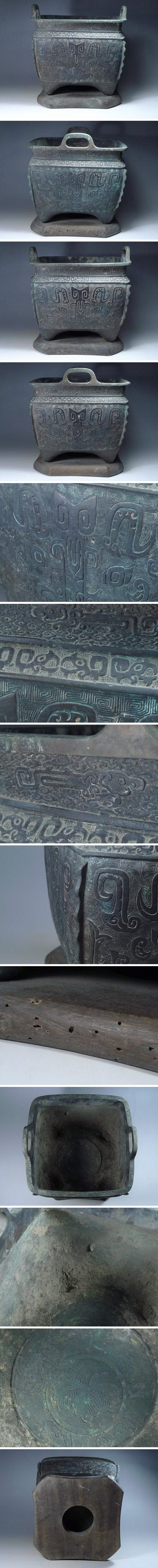 1416N01*05B▲中国美術 銅製 饕餮雲龍文彫刻四方四つ脚 火鉢 木製台座付き 瓶掛 手付き 茶道具 唐物 古玩 古銅 アンティーク 收藏