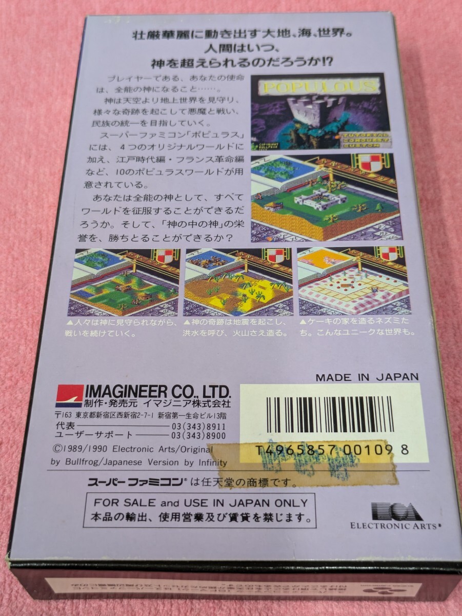 任天堂スーパーファミコンのカセット、ポピュラス、元箱取説付き、中古現状での出品になります。