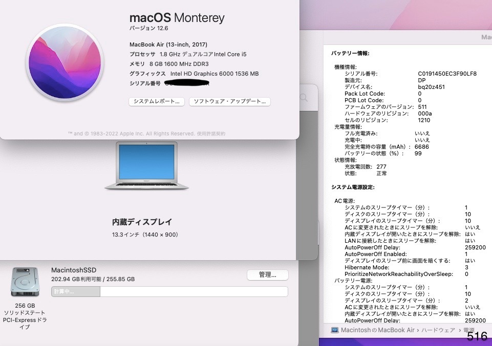 [美品]Apple MacBook Air 13inch 2017/Core i5 1.8GHz/メモリ8GB/SSD256GB/Windows11/Office 2021/516