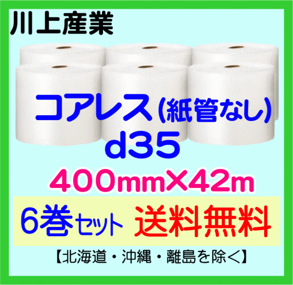 【川上産業 直送 6巻set 送料無料】d35 コアレスプチ 400mm×42m プエアークッション エアパッキン プチプチ エアキャップ 気泡緩衝材 收藏