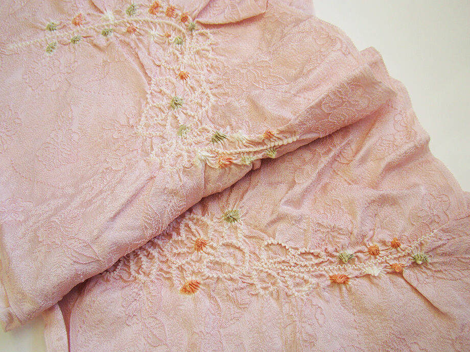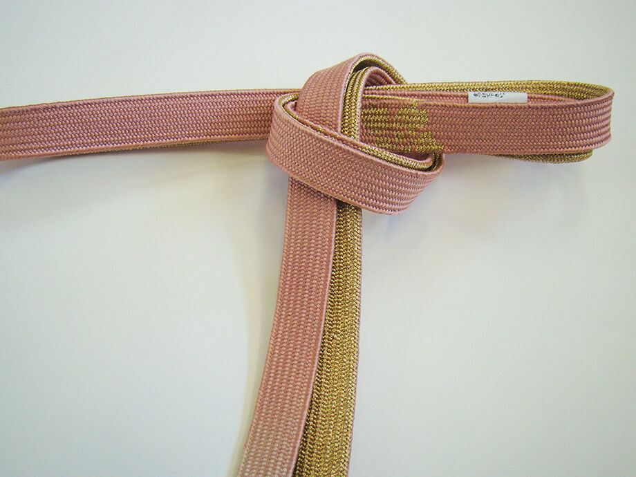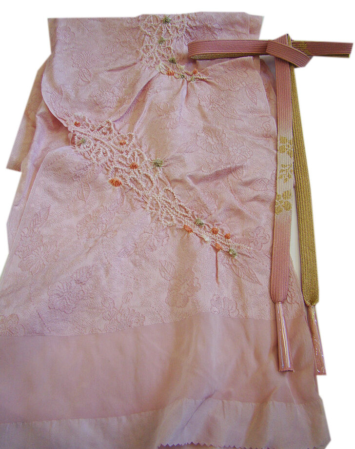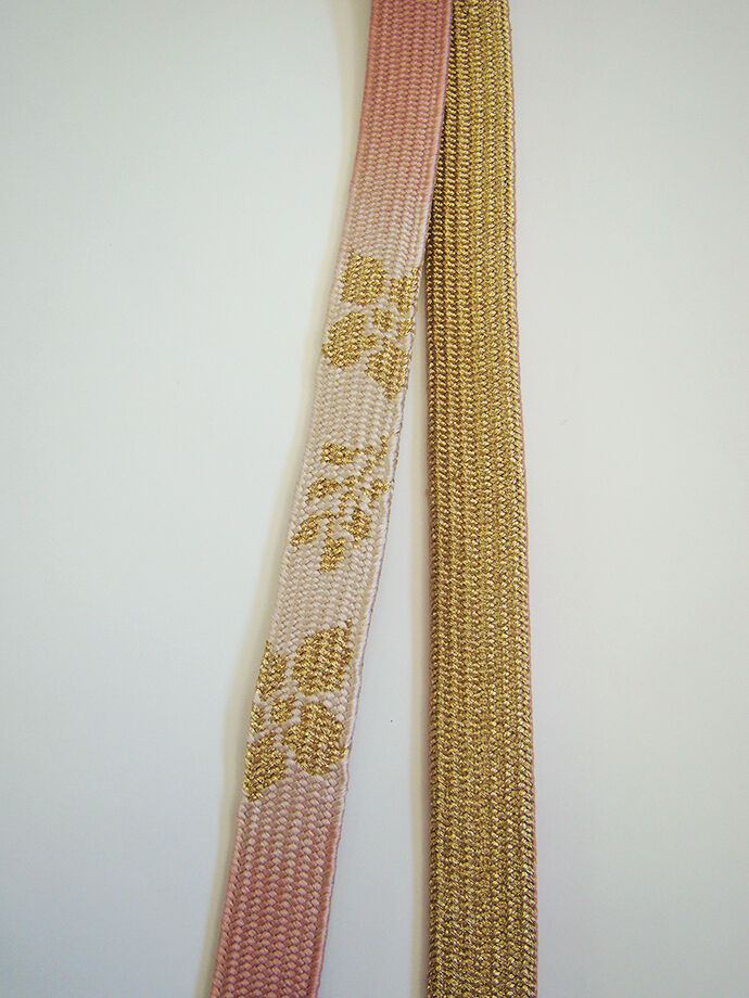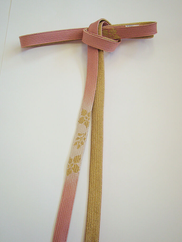 ●帯揚げ: 正絹。 しなやかなさらりとした滑らかなちりめん地、 淡い薄柿色地に花草柄の地模様入りに絞り入り。 ●帯〆: 正絹。 平組。 紅梅色地にぼかしに金糸入りの編み込みの組紐。 長さ160cm 幅1.7cm |
