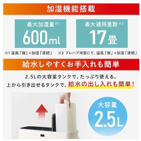 温風「強」+加湿「連続」:600mL/h / 温風「弱」+加湿「連続」:250mL/h / 加湿「連続」:380mL/h