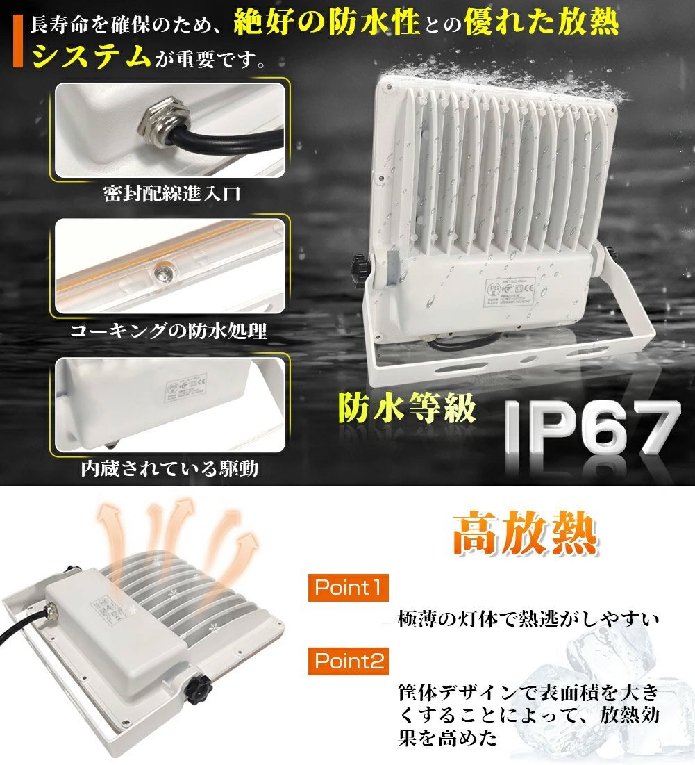 ◆軽薄化LED投光器: 1.5KGの軽量だから壁への負担を掛けずに壁掛けが可能、駆動内蔵設計で投光器の厚さはわずか4CMでよりスッキリと設置できます。 ◆超高輝度投光器: 優高輝度LEDチップを搭載で明るさは抜群、ハロゲン、水銀灯より80%消費電力を節約できます。 ◆IP67ラベルの防水性能: 密封性に優れ、IP67相当の防塵防水性能を実現!場所を選ばず様々な用途の照明に使えます。 ◆驚きの長寿命: 本製品は50000時間以上の長寿命で、他の商品の2000時間を遥かに凌駕します。 ◆照射角度調整可能: 回転支えを使えて、お好みに照射角度を調整できます。 ◆広い使用範囲: トンネル、掲示板、ガソリンスタンド、夜間作業、現場工事、駐車場、公園、運動場にも様々な場所で活躍します!公園、運動、屋外や現場作業にも便利です!特に、夕暮れ時夜間作業にとても役立ちます! 虫が集まりにくいの も魅力です。 【保証】 ◆当商品は12っヶ月保証となります。 ◆お届けから1週間以内にご連絡のあった不良品の保証対応の送料は当方が負担いたします。 ◆保証期間内の不良品ですが、交換のみ対応しております。往復送料はお客様負担となります。在庫がない時だけ返金しますので、ご了承ください。 |