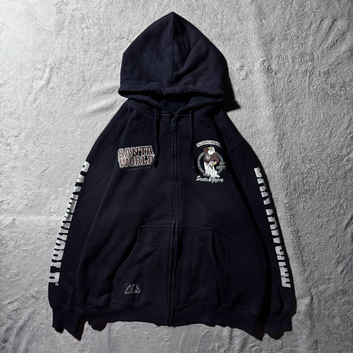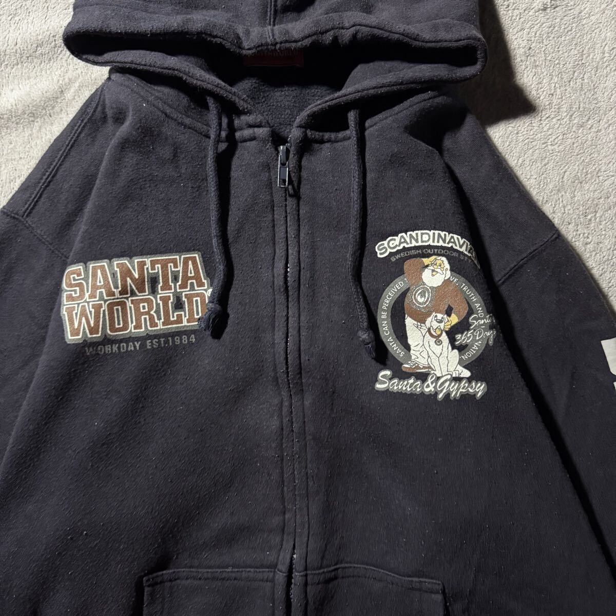 【Y7650】SANTAWORLD パーカー フルジップ サイズL ブラック 黒色 フルジップ プリントデザイン ロゴ メンズ トップス 最落なし 古着 收藏