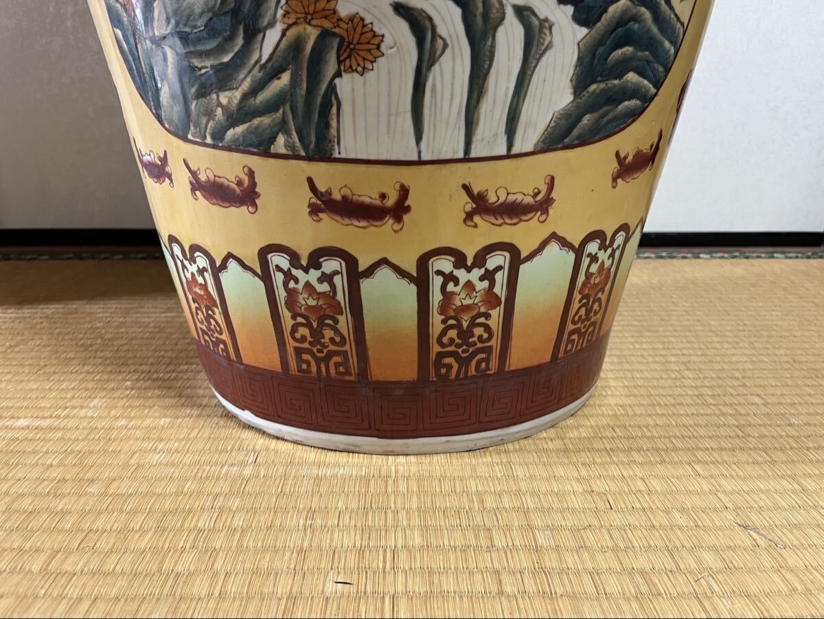 中国・景徳鎮様式による特大サイズの装飾壺です。黄地に雷文や蝙蝠文、胴には松鶴図と花鳥図を配した華やかな意匠。釉上彩による色彩も美しく、床の間や玄関の飾りに最適です。存在感のある大型サイズです。| 出价者 | 信用 | 价格 | 时间 |