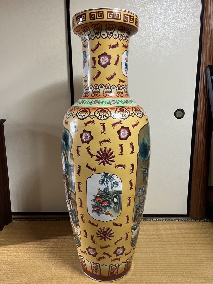 中国 景徳鎮様式 黄地 松鶴図 特大花瓶 大壺 釉上彩 高さ約125cm 幅45cm 口径30cm 床の間 玄関飾り 引取歓迎 收藏