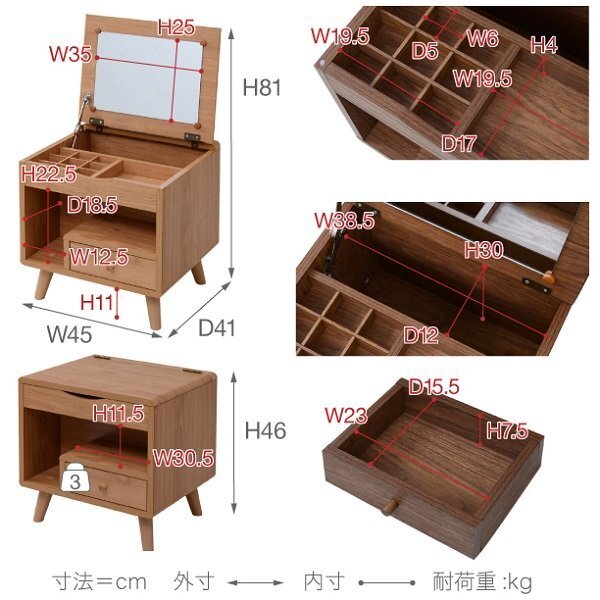| 【カラー】 ブラウン、ナチュラル、ホワイト 【サイズ】 <外寸> 幅45×奥行41×高さ46~81cm <内寸> オープン部:幅12.5×奥行18.5×高さ22.5cm 引き出し上部:幅30.5×奥行18.5×高さ11.5cm 扉内手前スペース:幅19.5×奥行17×高さ4cm 各仕切りスペース:幅6×奥行5×高さ4cm 扉内奥スペース:幅38.5×奥行12×高さ30cm 引き出し:幅23×奥行15.5×高さ7.5cm ミラー:幅35×高さ25×厚み0.3cm 脚元空間:高さ11cm 【材質】 本体:プリント紙化粧繊維板 脚:天然木 【耐荷重】 引き出し:(約)3kg以下 【生産国】 マレーシア 【梱包】 サイズ:53.5×44×15.5cm、重量:16kg 【その他】 ・六角レンチ同梱 ・背面化粧有り ・脚は天然木を使用しているため、商品によって色味や木目などの風合いが異なります。 ・脚裏フェルト付き 【組み立て品】 お客様による組み立てが必要です。 【ご注意】 ・サイズ、重量は概算です。 ・商品カラーはご使用のモニターによって実際の明るさや色と異なって見える場合がございます。 |