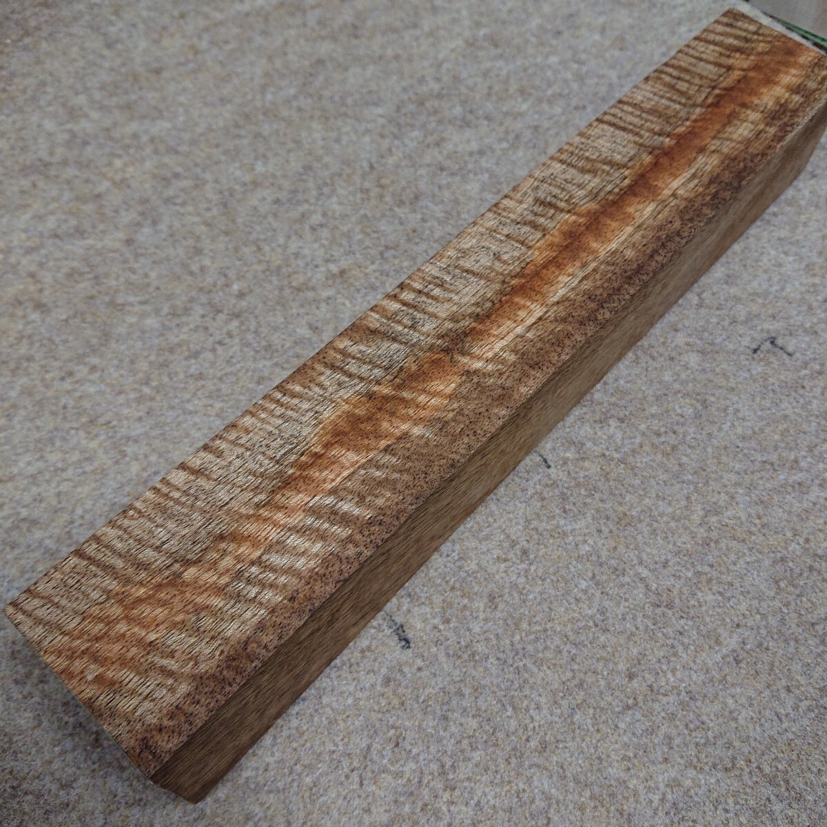 超希少銘木マンゴー超極美杢美柾超極縮み杢の極厚ブロックです。約長さ350mm 幅58mm 厚さ53mm 545gです。杢を見やすくするために水引きをして撮影しています。たいへん美しい杢と柾に極縮み杢が浮かび上がっています。盤の端のほうでしか取れない貴重な材です。乾燥良材です。