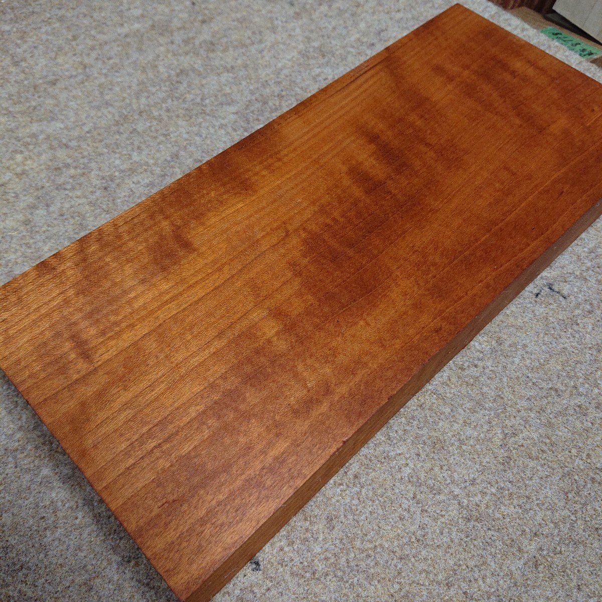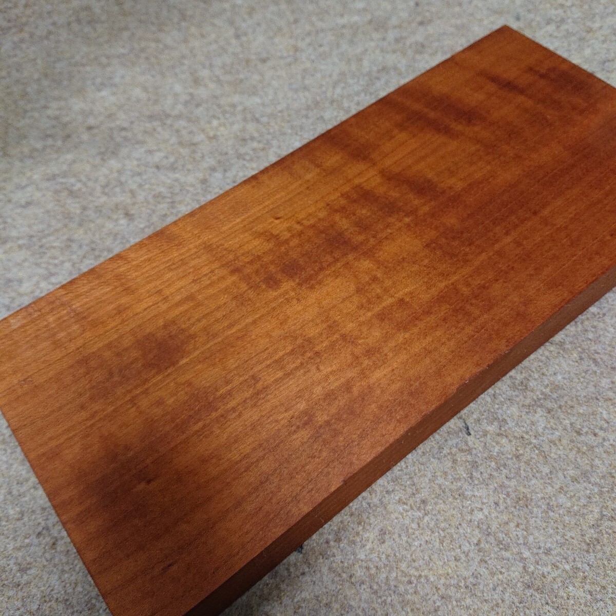 希少銘木チェリー極美柾極縮み杢の幅広極厚ブロックです。約長さ315mm 幅142mm 厚さ33mm 973gです。杢を見やすくするために水引きをして撮影しています。たいへん美しい柾と縮み杢が鮮やかに浮かび上がっています。乾燥良材です。