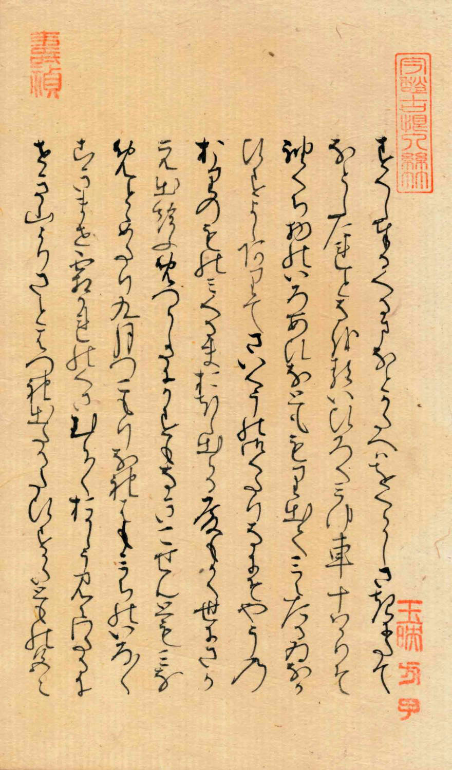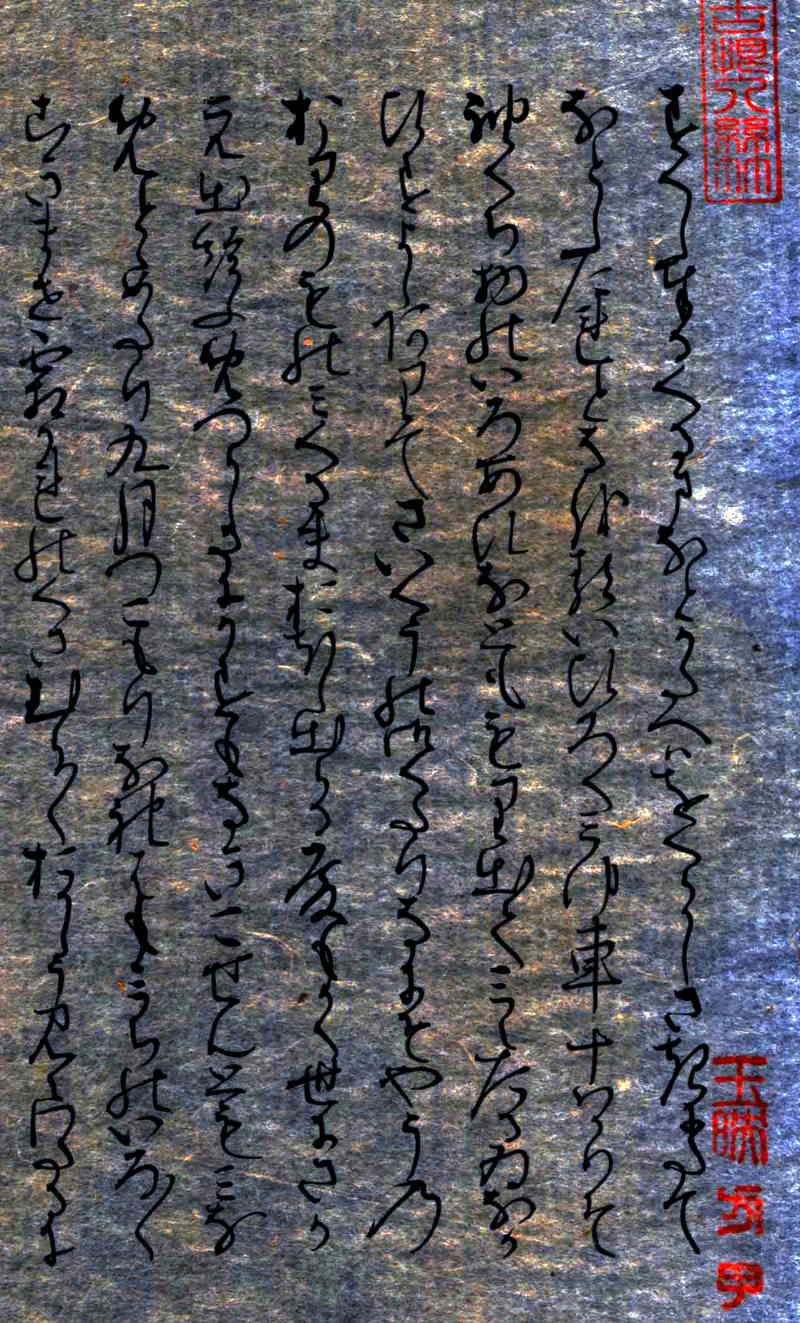 「関屋(せきや)」原本自筆上部には、「今愁古恨入絲竹」《今の愁(うれ)い古(いにしえ)の恨み糸竹(しちく)に入る》という漢文の篆書印が押捺されている。言葉の意味は、「今人の愁い、古人の悲しみ、楽の音に籠(こも)る」という内容です。紫式部がこの原詩に親しんでいたことがわかる。