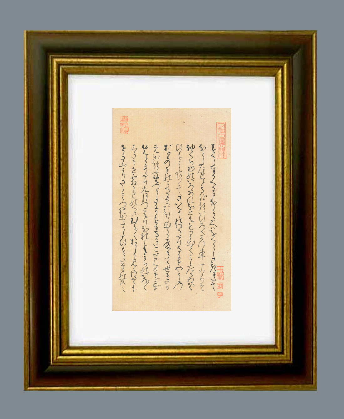 「源氏物語」自筆の大きさ タテ21.8センチ ヨコ12.8センチ。額縁の大きさは タテ37.0センチ ヨコ28.0センチです。額縁は新品です。 |